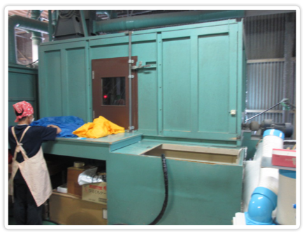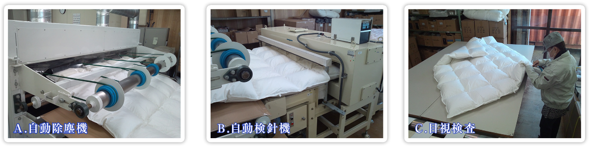 続いて自動検針機に通して、お布団の中に針や不純物が混入していないかを確認します。
