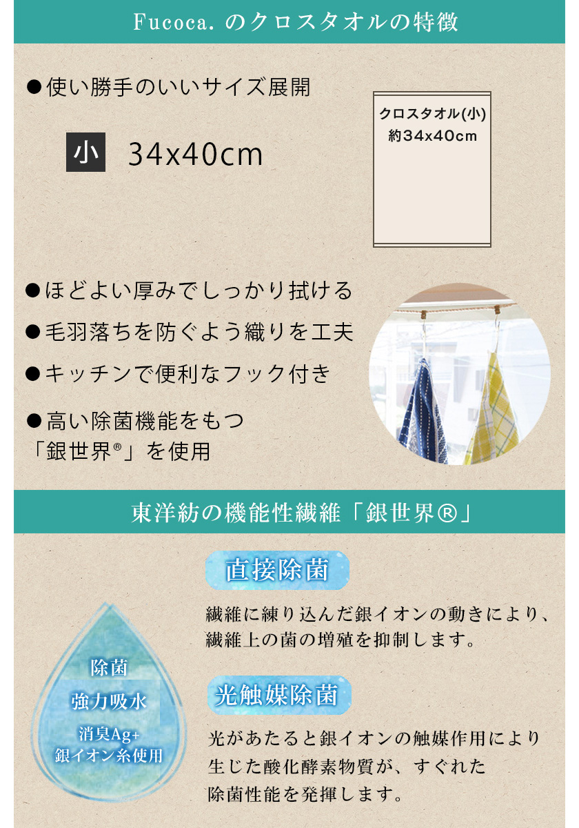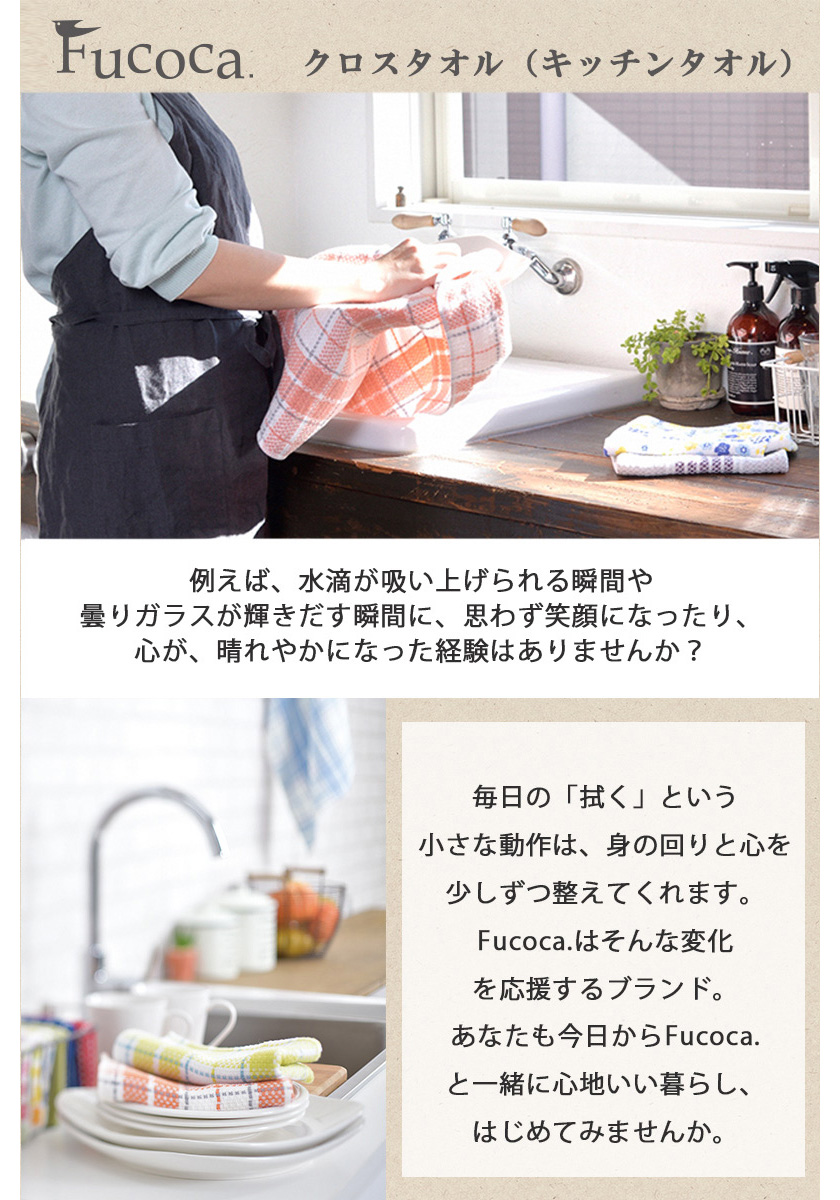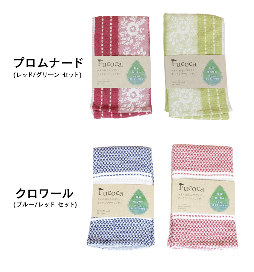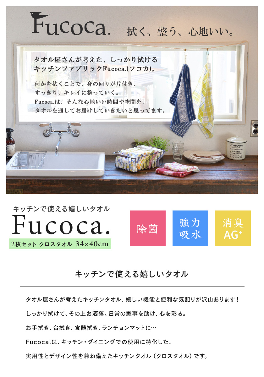 タオル屋さんが考えた、しっかり拭けるキッチンファブリックFucoca 除菌 強力吸水 消臭AG+ キッチンで使える嬉しいタオル 2色1セット 34x40cm