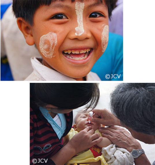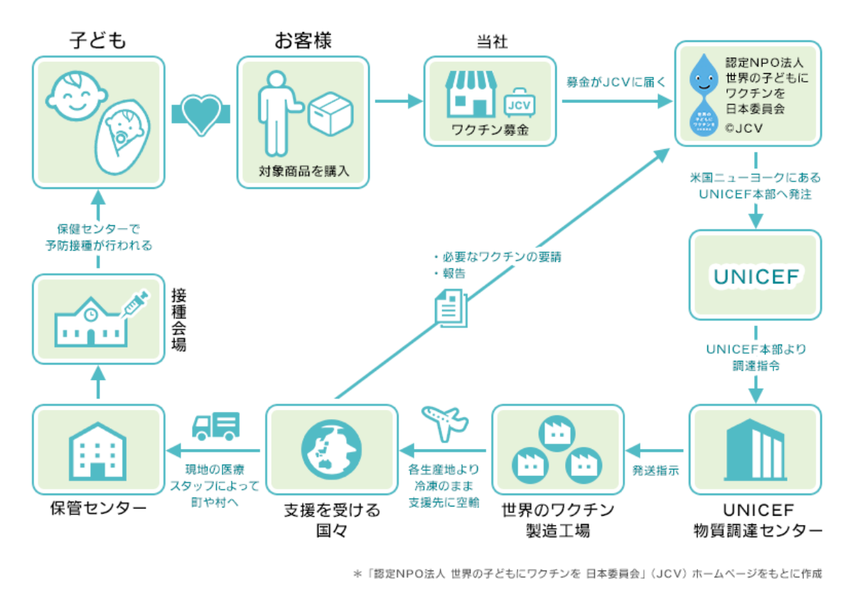 このような子どもたちが数多くいる開発途上国で、1 人でも多くの子どもが病気に負けず、夢と希望を持ち、笑顔で毎日を過ごせるよう、お客様からの心のこもった募金を「認定NPO法人 世界の子どもにワクチンを 日本委員会」(JCV)を通してワクチンに換え、確実に接種されるように届けています。