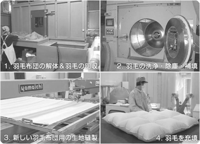 長年ご愛用頂いたお客様の羽毛布団をお預かりし、解体・羽毛の洗浄・除塵を行い、不足分の羽毛を補填して、再び羽毛布団として仕立て直し致します。愛着のある羽毛布団を大切に再生することで、捨てずに大事に使い続ける循環型社会に貢献します。